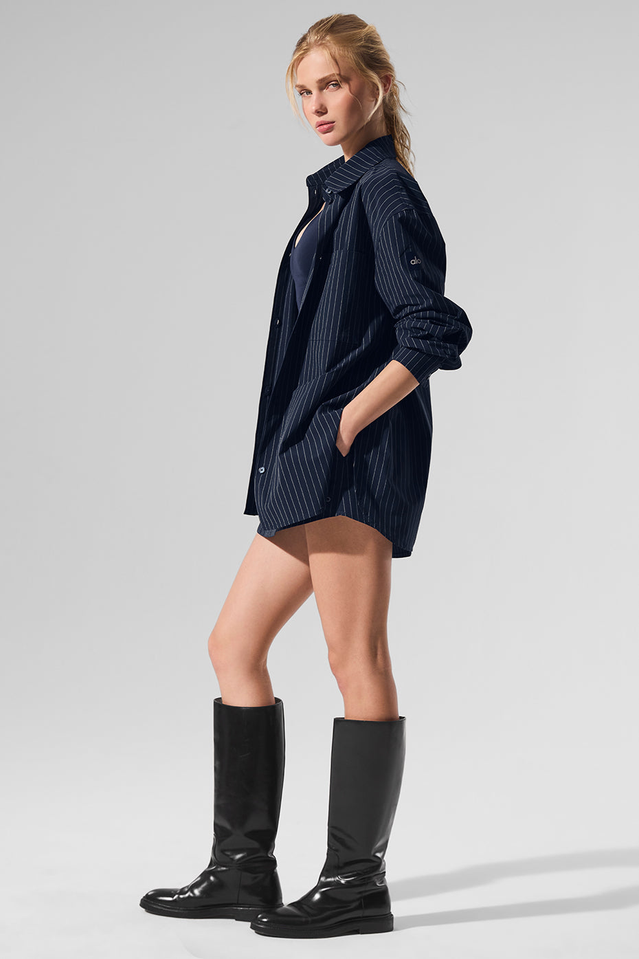 Add this button down to any outfit to instantly level up your look. It’s oversized, slightly boxy, and features a classic collar. The lightweight feel makes it ideal for layering over a sports bra or tank, and the structured fit is buttoned-up enough for the office or a night out. Stripe right and pair it with the matching Pinstripe Daylight Boxer Short.