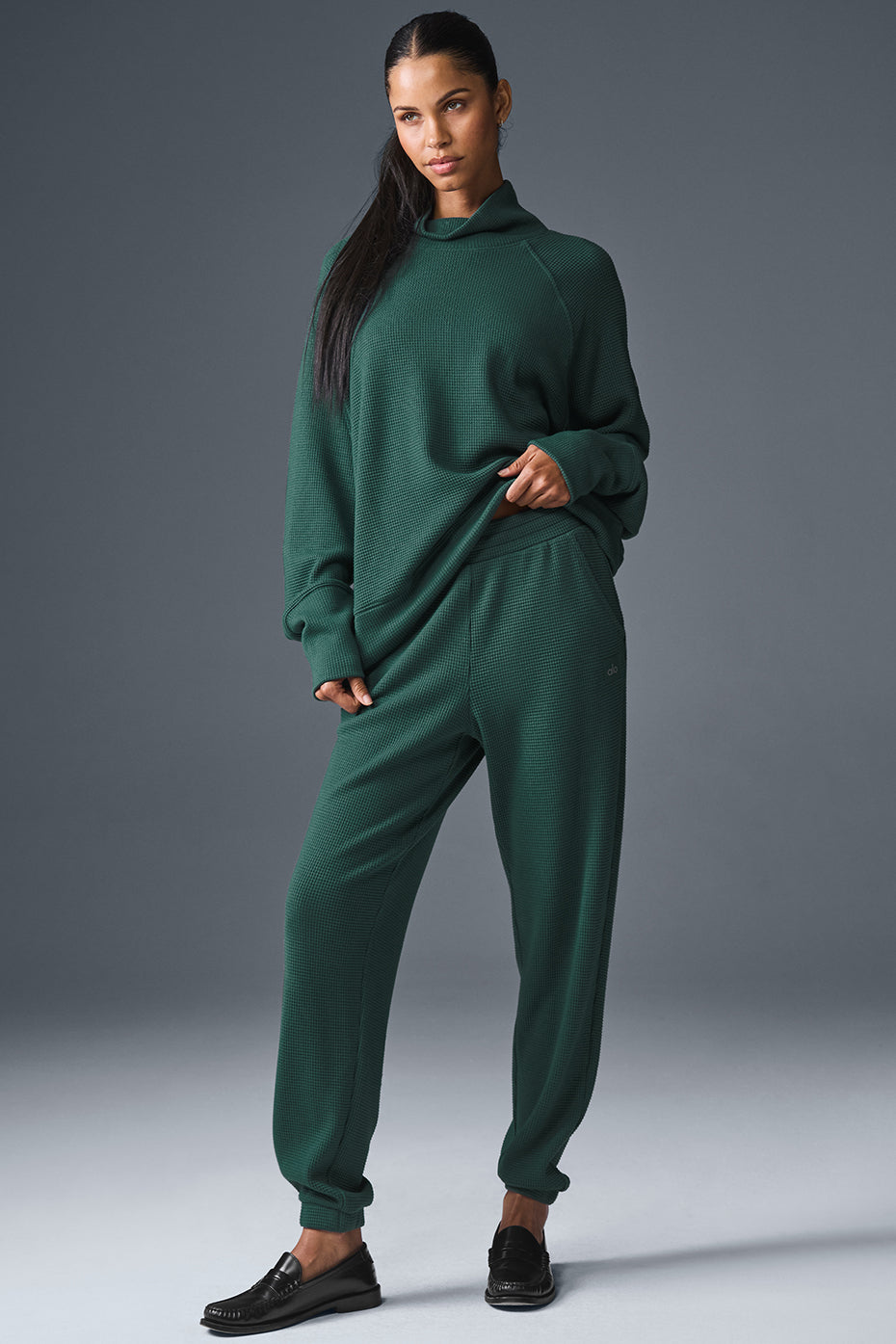You'll chill in them, take walks around the block in them, tackle long-haul flights in them—these lounge pants are that good. They're made from a soft, warm waffle knit with a stretchy high-rise waistband, a laid-back (but not loose) fit and cozy ankle cuffs. Side pockets and a tonal ALO patch round it all out. And for cutest results, pair them with the matching bra and mock neck shirt.